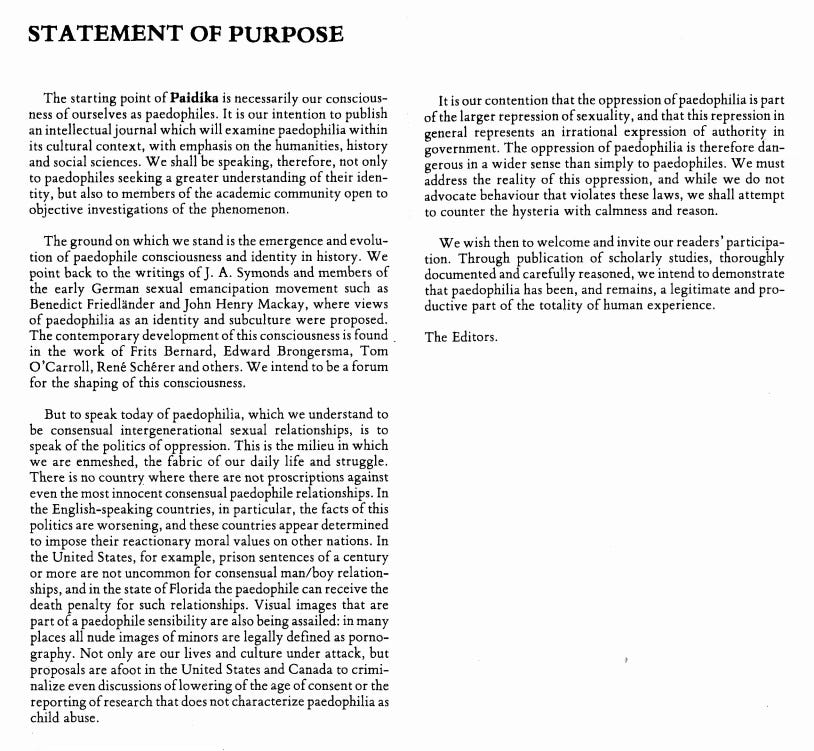 The starting point of Paidika is necessarily our consciousness of ourselves as paedophiles. It is our intention to publish an intellectual journal which will examine paedophilia within its cultural context, with emphasis on the humanities, history and social sciences. We shall be speaking, therefore, not only to paedophiles seeking a greater understanding of their identity, but also to members of the academic community open to objective investigations of the phenomenon.