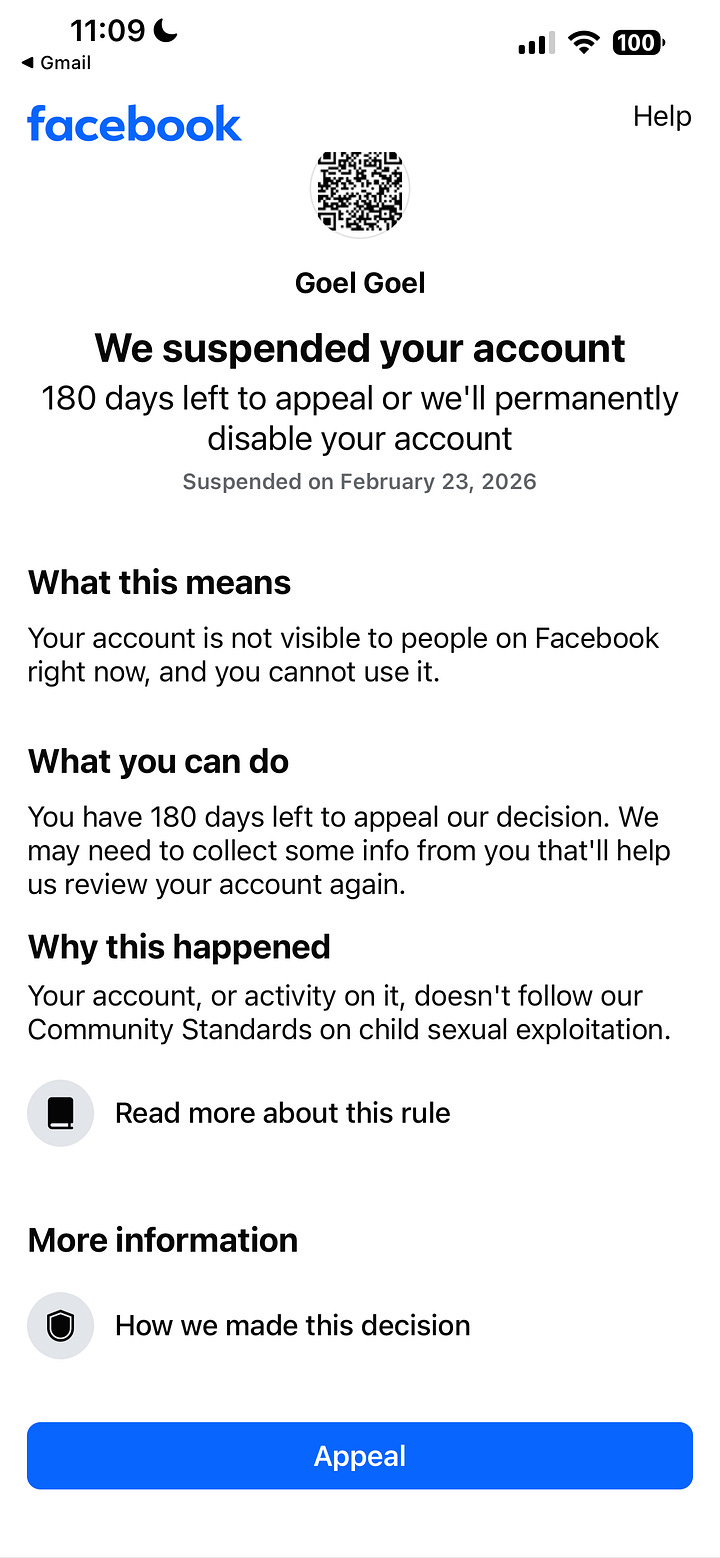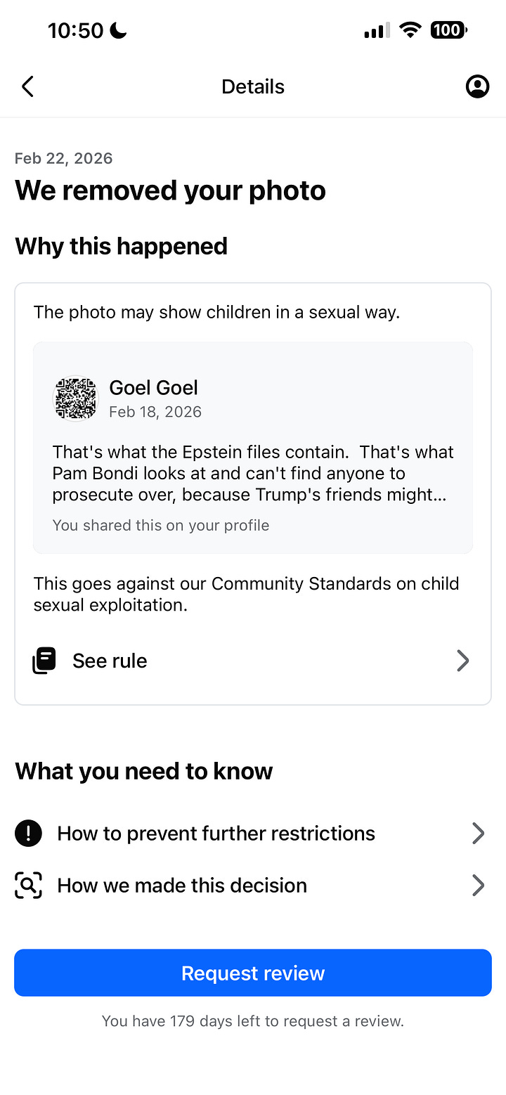 Earlier tonight, Facebook suspended my account because I posted a blacked out picture of a little girl from the Epstein files drop. I first noticed this picture on MMA fighter Jake Shields’s X acco…